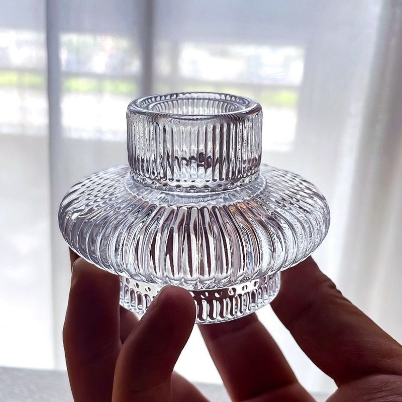 These ribbed glass candle holders are sold in a pair of two. Featuring a narrow opening at the top and a wide opening at the bottom, these versatile dual-use holders can accommodate either dinner candles or tealight candles. Simply turn them around to fit the candle of your choice!
